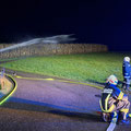 Bereits während der Anfahrt erhielten wir den Auftrag, einen Atemschutztrupp zur Personenrettung bereitzustellen und die Zubringerleitung aufzubauen. Im weiteren Verlauf errichteten wir die Atemschutzsammelstelle und führten mit mehreren C-Rohren einen Außenangriff durch.